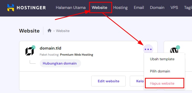 Pada hPanel → Website, hapus website yang baru saja dibuat: