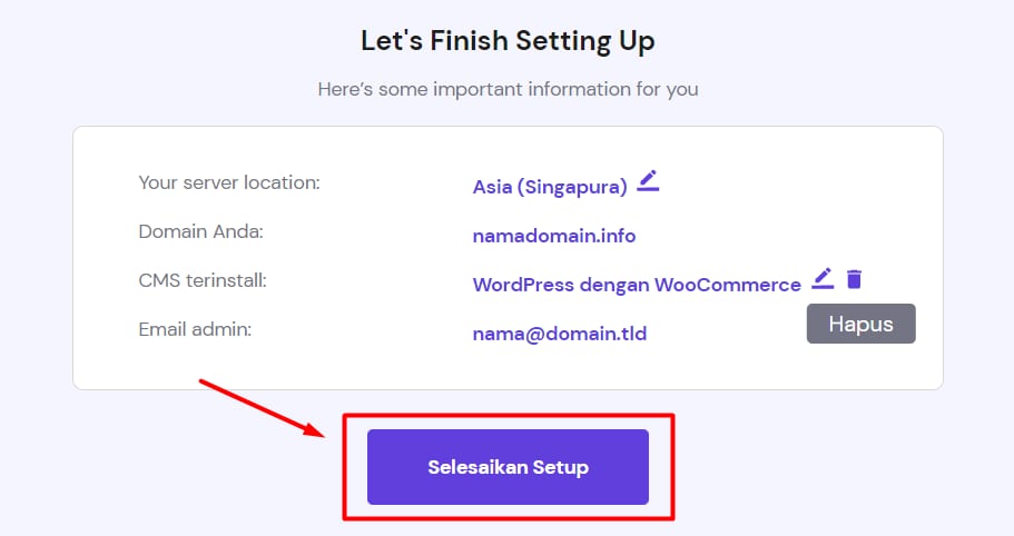 Sebelum menyelesaikan penginstalan, Anda akan melihat ringkasan dari opsi yang telah dipilih. Klik tombol edit atau hapus jika Anda ingin membuat perubahan. Klik Selesaikan Setup jika sudah sesuai: