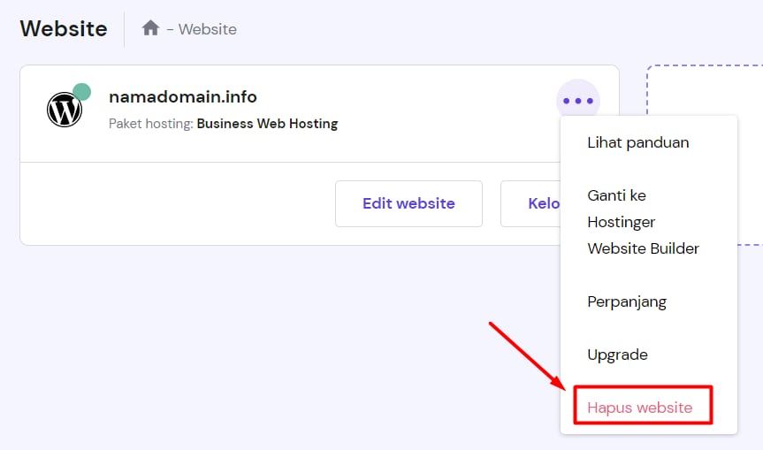 Jika Anda ingin menghapus instalasi WordPress Anda, sangat dianjurkan untuk terlebih dahulu membuat dan mengunduh backup. Kemudian, pilih Website, klik tombol (⋮), dan pilih hapus website: