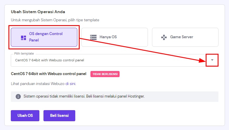 Scroll ke bagian Ubah Sistem Operasi Anda, pilih OS dengan Control Panel, dan pilih template OS yang diinginkan dari daftar. Anda bisa langsung membeli lisensi berbayar: