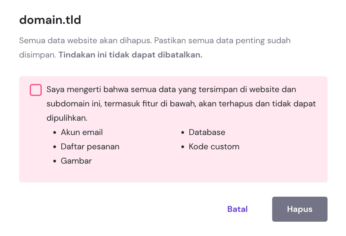 Langkah selanjutnya adalah menghapus website asli dari paket hosting Anda. Jika tidak, nama domain tidak bisa digunakan di akun Hostinger lainnya.