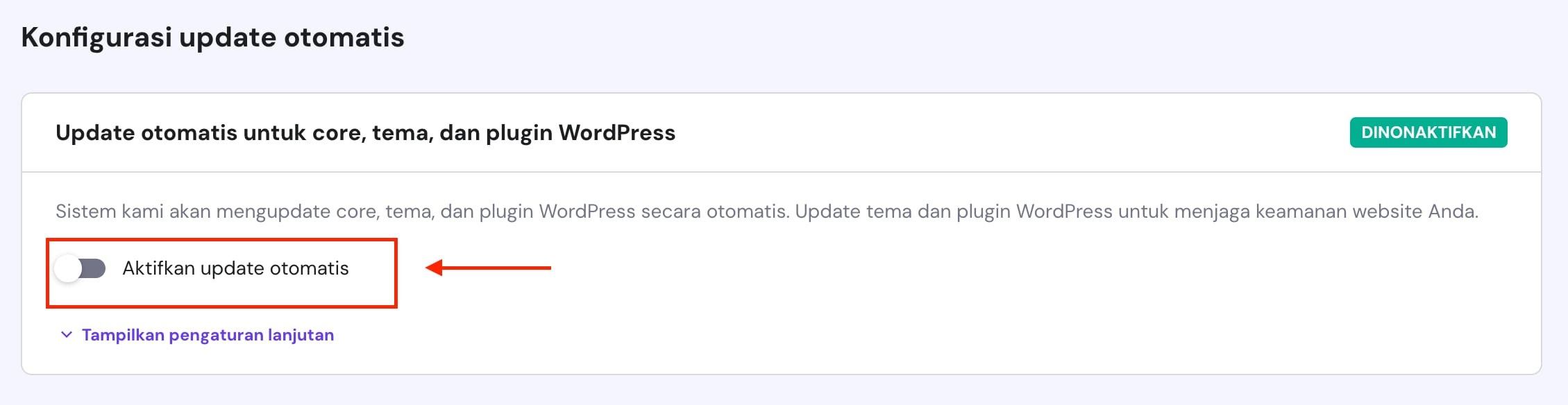 Klik Tampilkan pengaturan lanjutan untuk mengatur update otomatis pada WordPress core, plugin, dan tema: