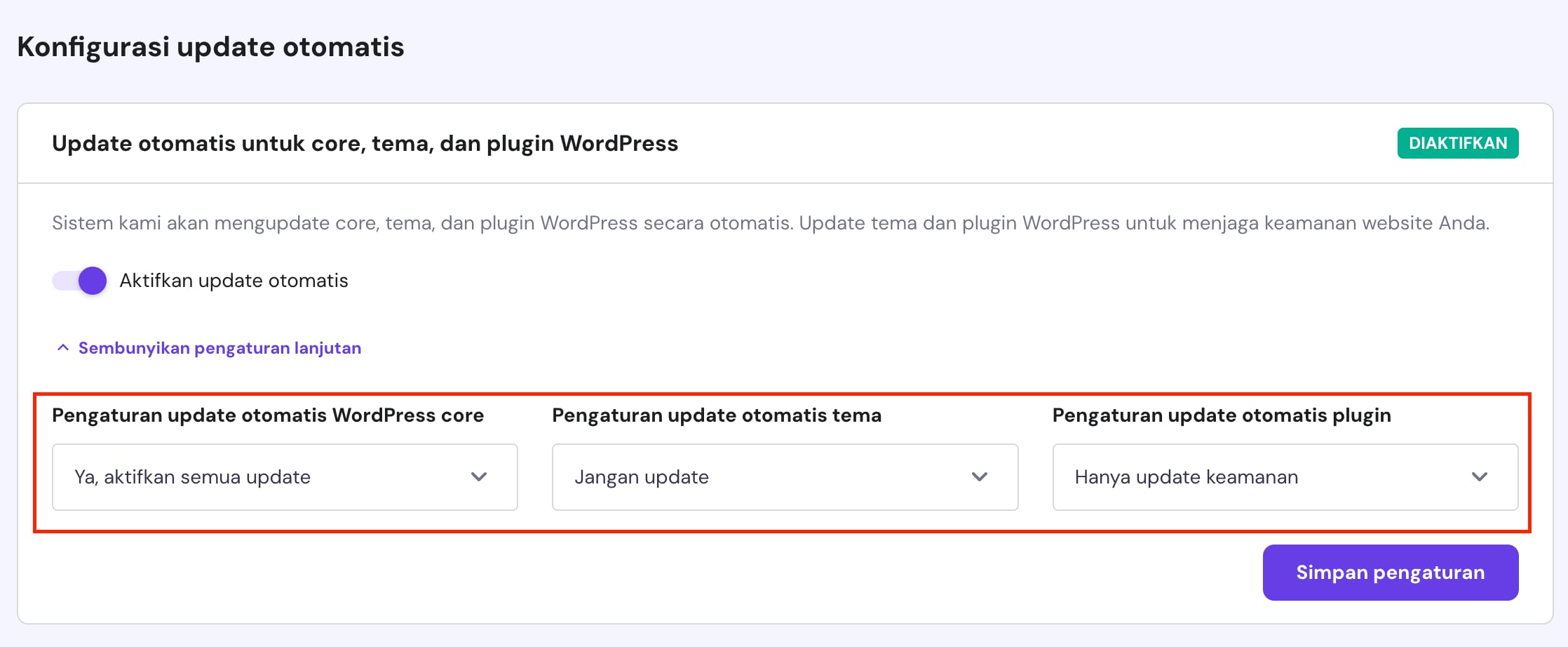 Setelah mengaktifkan update WordPress otomatis di hPanel, update otomatis dari WordPress akan dinonaktifkan💡