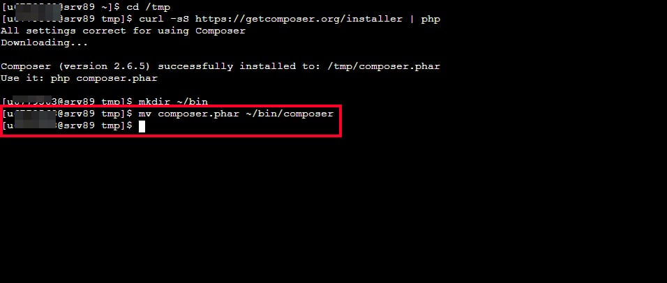 6. Anda bisa memasukkan perintah mv composer.phar ~/bin/composer untuk memindahkan instalasi composer sebelumnya ke direktori bin.