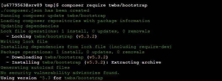 4. Masukkan perintah instal package: composer require twbs/bootstrap pada SSH. Tunggu prosesnya hingga Composer selesai menginstal package.