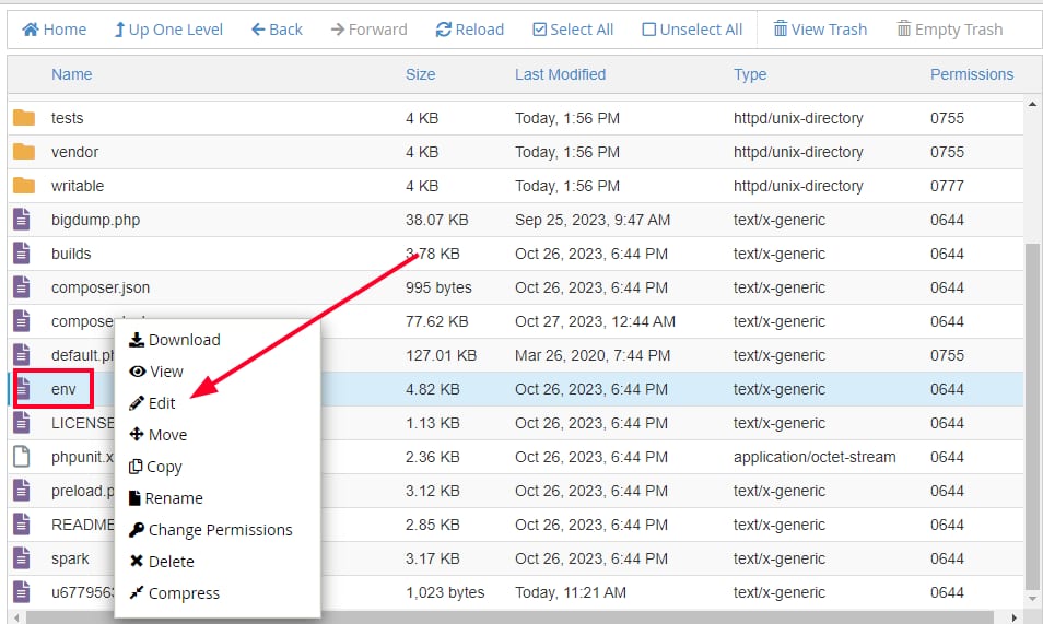 2. Silakan masuk ke direktori /public_html/[nama aplikasi CodeIgniter Anda] dan temukan file env di dalamnya.