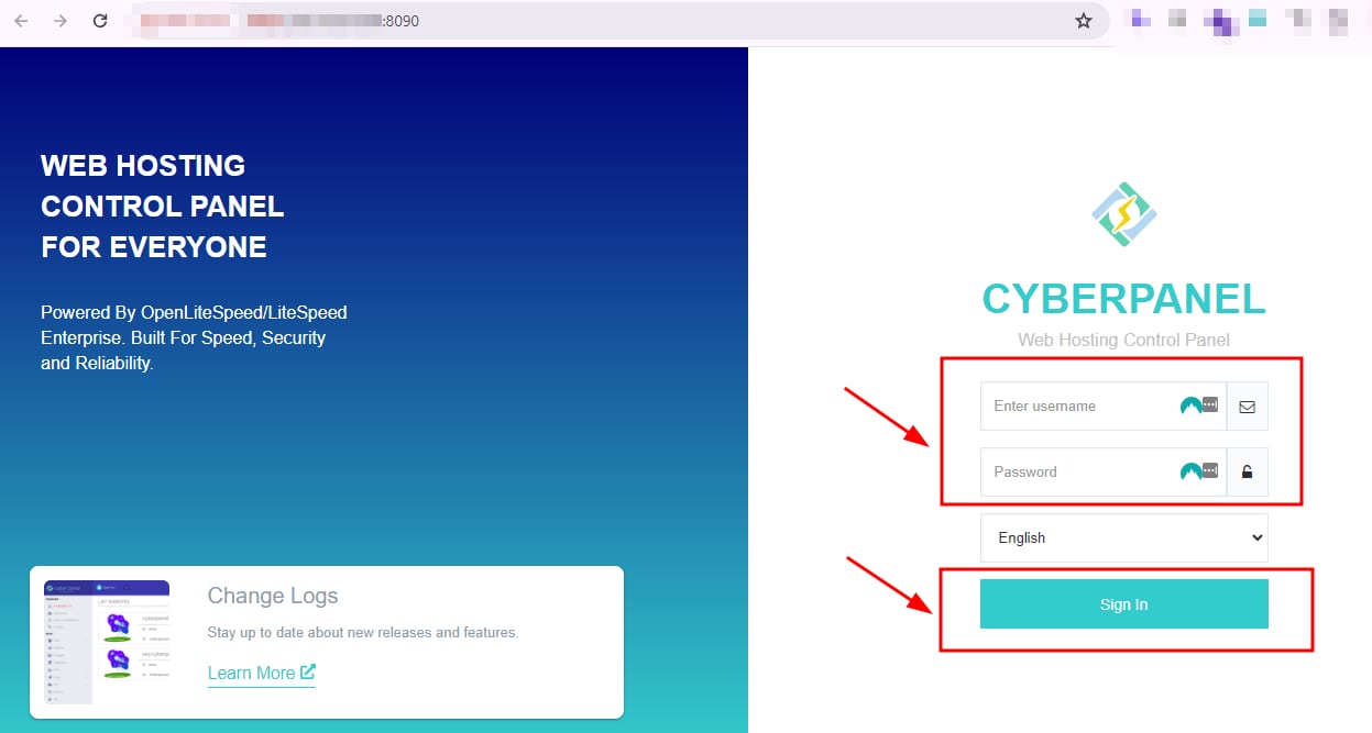 1. Masuk ke halaman login CyberPanel dengan cara akses URL berikut. https://IP-VPS-Anda:8090 pada web browser.