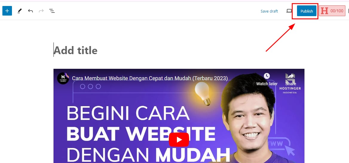 8. Klik tombol Publish di pojok kanan atas untuk mempublikasi post yang berisi embed video YouTube.