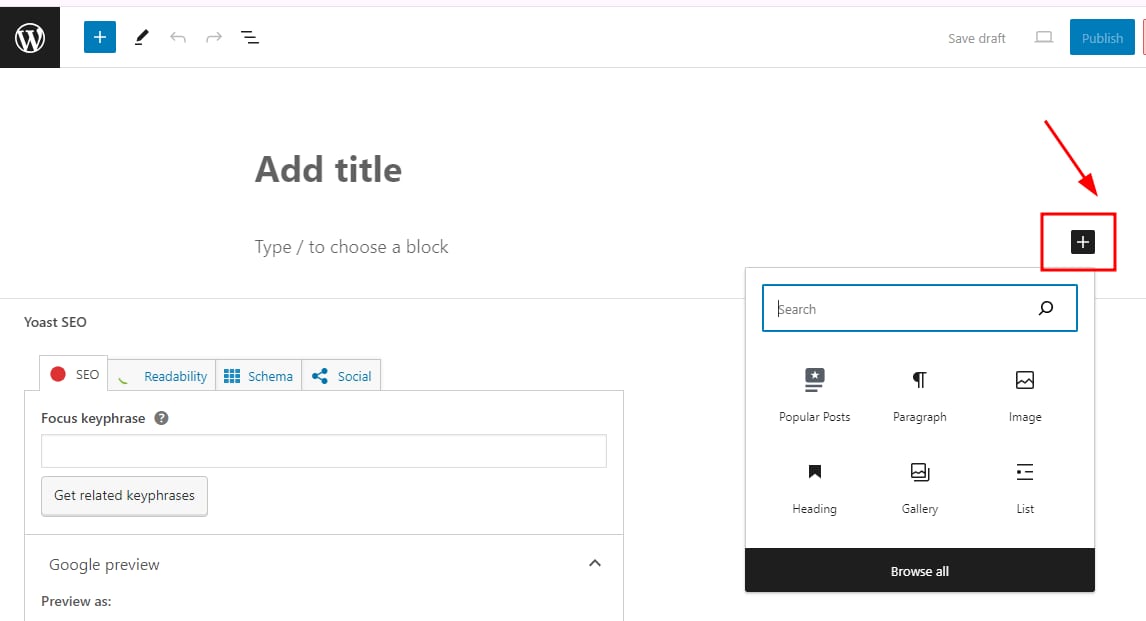 3. Anda akan diarahkan ke halaman Posts. Arahkan kursor ke bawah judul, kemudian klik ikon plus (+) di sebelah kanan.