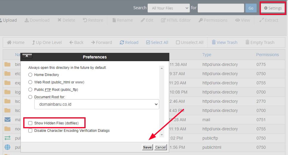 2. Klik menu Settings pada bagian kanan atas. Centang opsi Show Hidden Files (dotfiles), kemudian klik tombol Save.
