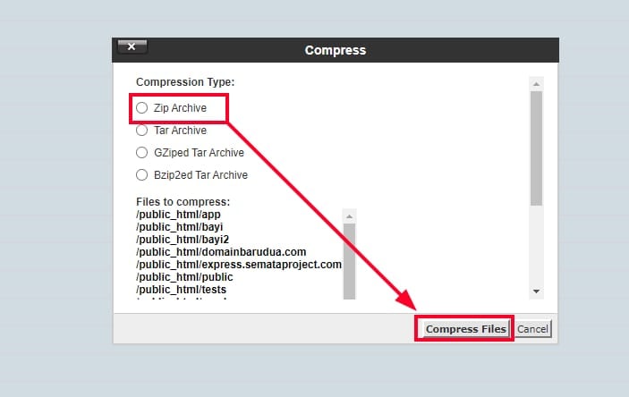 5. Pilih Zip Archive, kemudian klik tombol Compress Files.