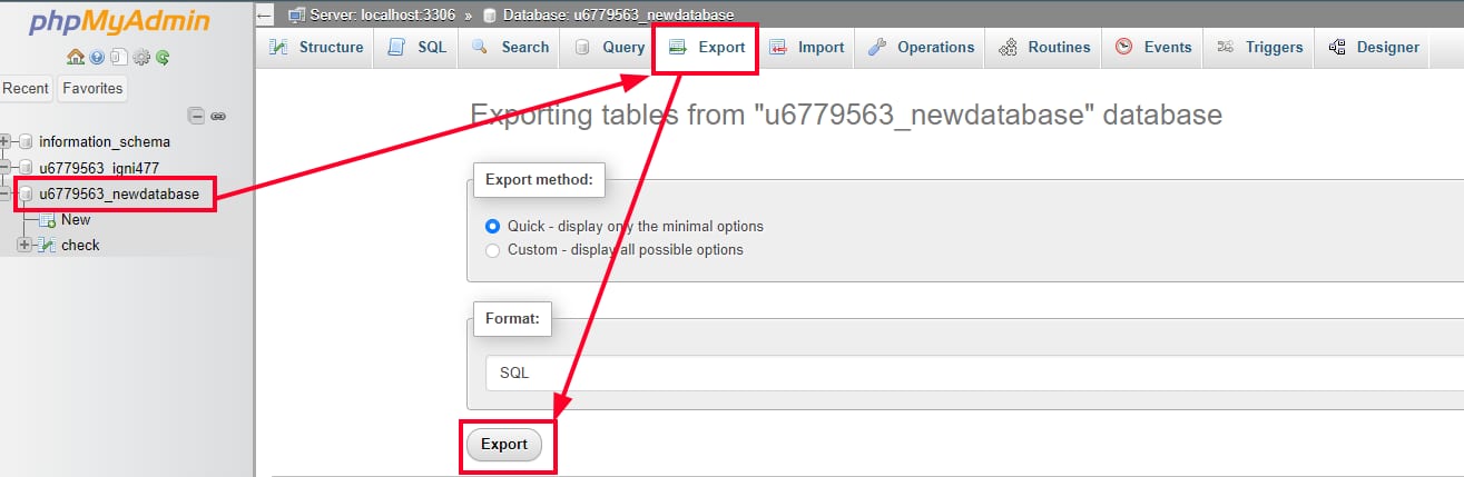 2. Klik database milik Anda. Pilih menu Export pada bagian atas. Klik tombol Go.