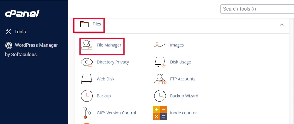 1. Pada halaman cPanel, gulir ke bagian Files dan buka menu File Manager.