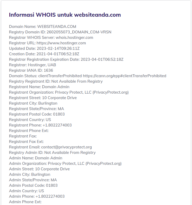 Kemudian, buka tool pencarian WHOIS dan masukkan nama domain Anda untuk mencari tahu apakah detail kontak Anda sudah disembunyikan. Kalau tidak ada informasi pribadi yang muncul, misalnya alamat email Anda, artinya layanan perlindungan privasi domain sudah aktif.