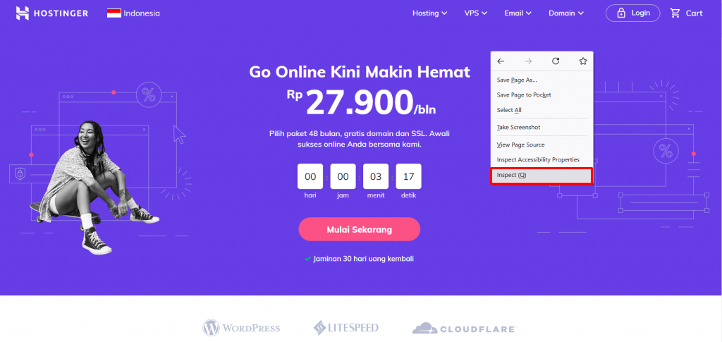 Buka sebuah website. Kami kembali menggunakan hostinger.co.id di contoh ini.