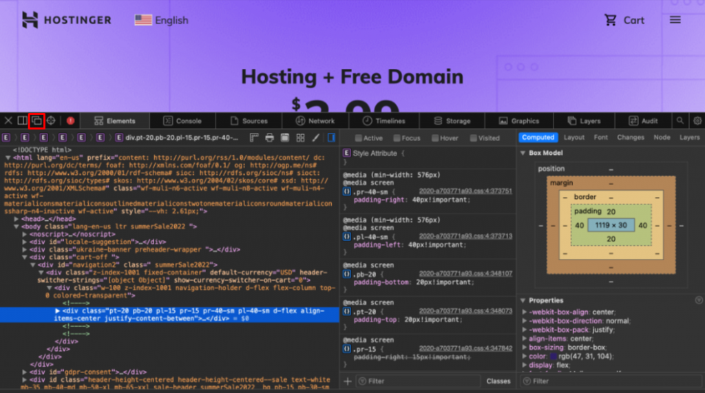Dengan tool ini, Anda bisa memilih elemen tertentu untuk menemukan kodenya. Klik tool Inspect di pojok kiri atas panel untuk mengaktifkan mode pemilihan.