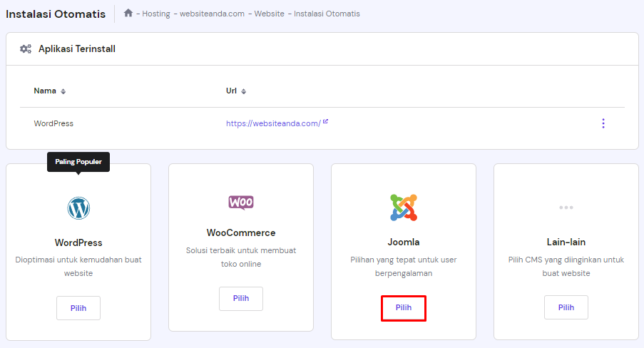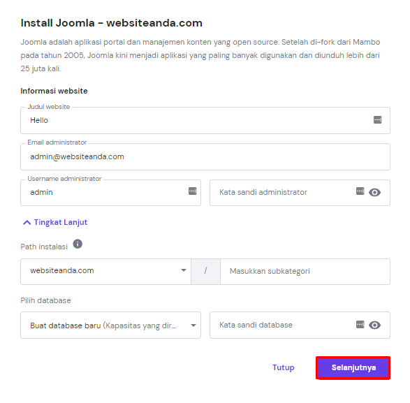 Ada banyak hosting yang menyertakan auto-installer – sebuah tool yang dapat Anda gunakan untuk instal Joomla dengan cepat. Anda hanya perlu melengkapi beberapa informasi dan sisanya menjadi tugas software!