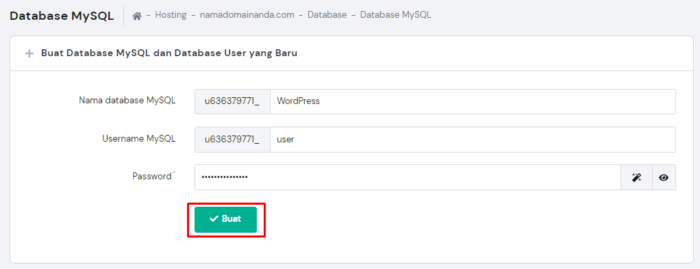 PENTING! Pastikan untuk menyalin kredensial MySQL Anda, lengkap dengan string alfanumeriknya, karena Anda akan membutuhkannya nanti.