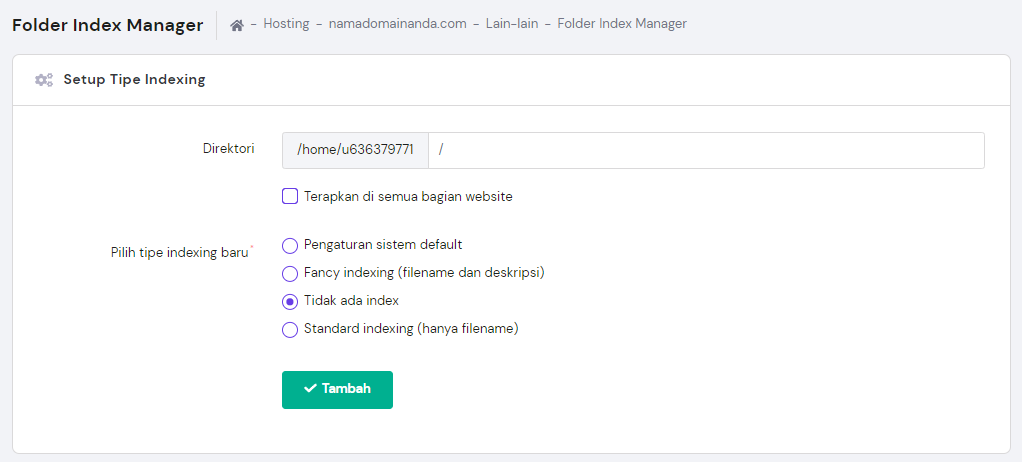 Kemudian, pilih public_html untuk direktori, dan pilih Tidak ada index di sebelah Pilih tipe indexing baru.
