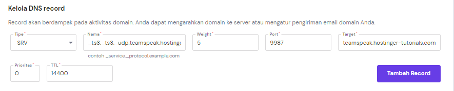 Di DNS Zone Editor yang sama, scroll ke bawah sampai Anda menemukan panel kelola SRV.