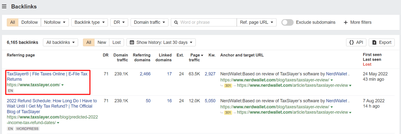 Misalnya, artikel ulasan dari NerdWallet ini menjelaskan secara lengkap struktur harga dan fitur utama perusahaan keuangan bernama TaxSlayer. Menurut data dari Ahrefs, review tersebut telah meraup 6.000+ backlink, termasuk dari TaxSlayer sendiri.