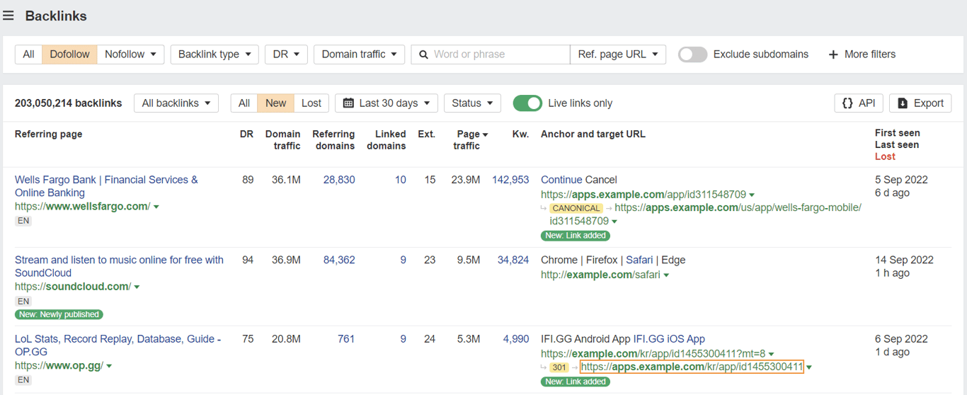 Ahrefs akan meyajikan laporan backlink yang dimiliki domain pesaing, beserta kata kunci dan traffic bulanan halaman tersebut.
