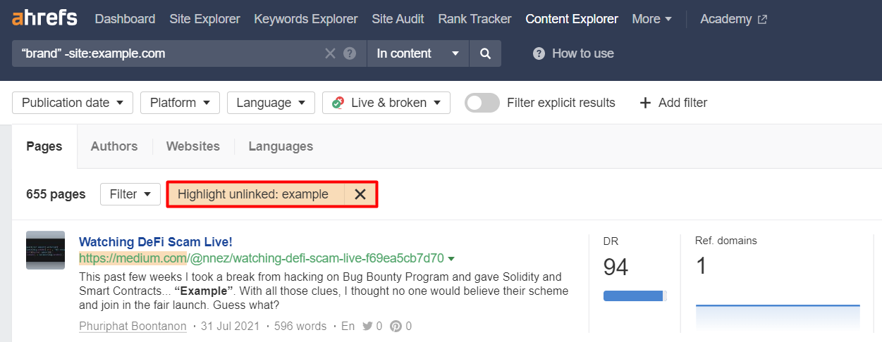 Apabila brand atau website Anda sudah punya banyak audiens, temukan website yang menyebut brand Anda dalam kontennya tapi belum menaruh link ke website Anda. Gunakan tool SEO seperti Ahrefs: