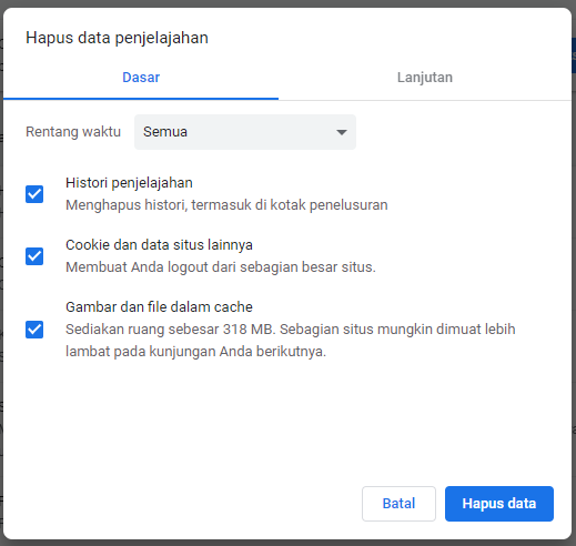 Untuk mengatasinya, Anda bisa clear cache dan cookie browser. Namun, perlu diingat bahwa menghapus cache dan cookie bisa menyebabkan waktu loading berikutnya menjadi lambat karena browser harus meminta semua file website lagi. Anda juga akan logout dari semua website yang tadinya sudah Anda akses untuk login.