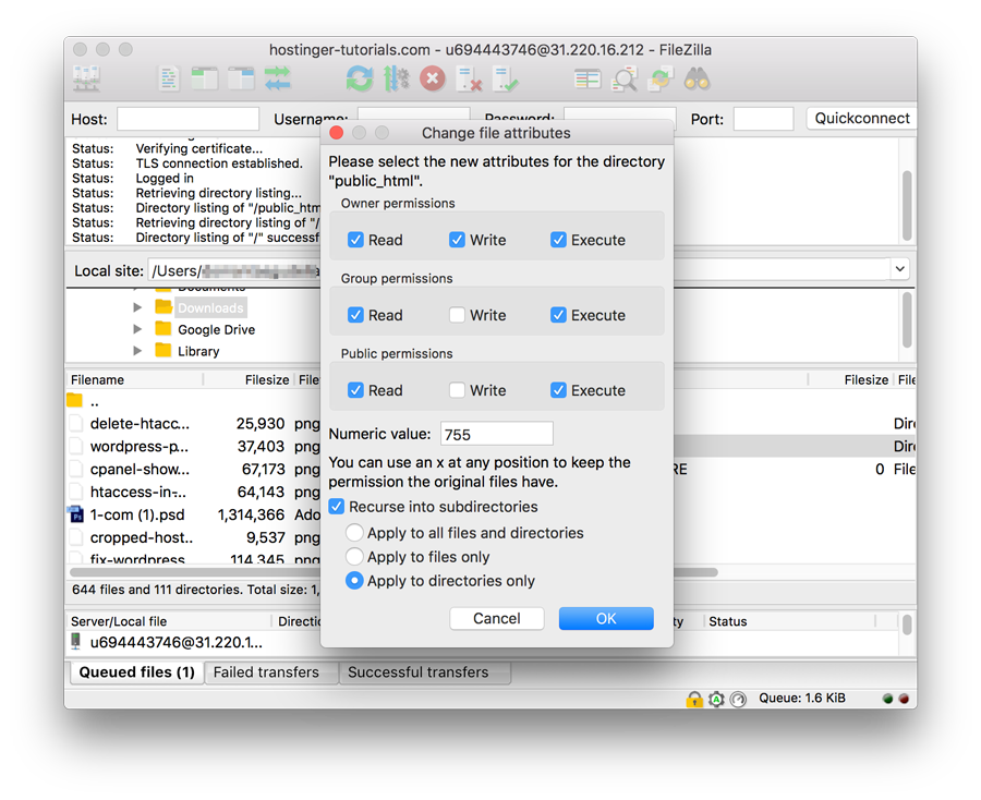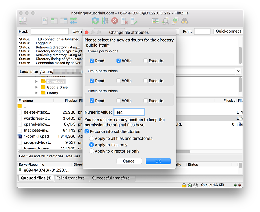 Anda bisa melakukannya dengan bantuan aplikasi FTP atau File Manager. Aplikasi FileZilla FTP client menyediakan lebih banyak opsi untuk mengubah permission file dan folder. Sangat kami rekomendasikan jika Anda menggunakan aplikasi FTP client untuk melakukan langkah-langkah di bawah ini: