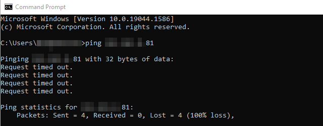 Akan tetapi, kalau hasil ping menunjukkan ‘request timeout’ (waktu permintaan habis), berarti alamat IP atau nama domain tujuan tidak merespons dan respons pong tidak diterima.