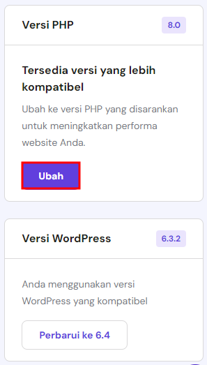 Apabila versi PHP yang digunakan tidak kompatibel dengan instalan WordPress Anda, akan ada notifikasi yang meminta Anda beralih ke versi yang kompatibel. Cukup klik tombol Ubah untuk memulai proses update versi PHP.