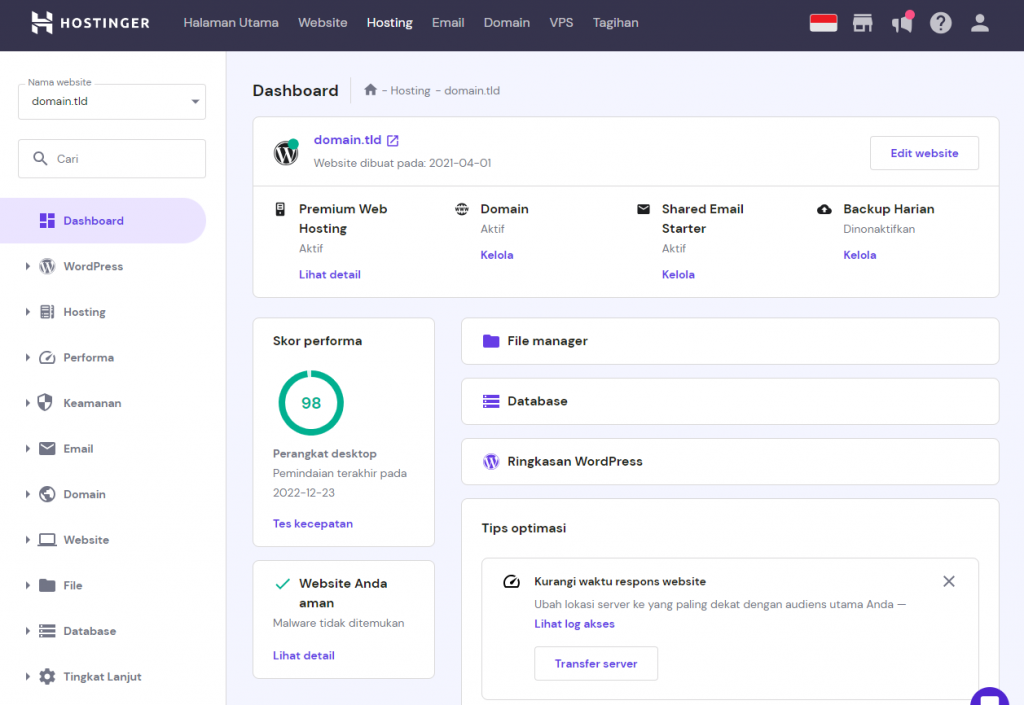 Sekilas tampilan hPanel mirip cPanel, tapi lebih mudah digunakan dan intuitif. Control panel ini juga tersedia dalam lebih dari 10 bahasa, termasuk bahasa Indonesia, Inggris, Spanyol, dan Prancis.