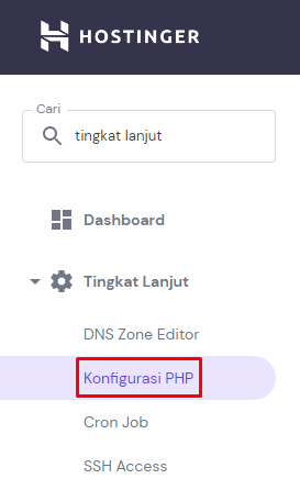 Kalau Anda adalah pengguna Hostinger, Anda bisa melakukannya sendiri dengan mudah. Buka hPanel, lalu buka dashboard Akun Hosting Anda. Kemudian, klik Konfigurasi PHP di bagian Tingkat Lanjut.