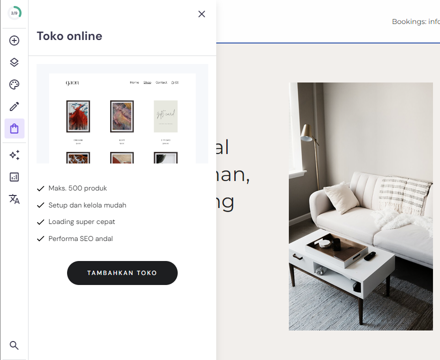 Website Builder Hostinger sudah dilengkapi dengan teknologi AI dan integrasi tool pemasaran seperti Google Ads, WhatsApp, dan Facebook Pixel untuk mempromosikan barang-barang yang Anda jual.