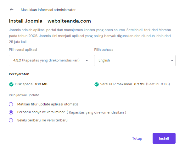 - Pilih versi aplikasi, bahasa, dan jadwal update. Lalu klik Install.