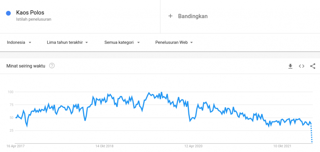 Dari grafik di atas, bisa dilihat bahwa meskipun hasil pencarian untuk kaos polos sempat turun, popularitasnya masih cukup tinggi. Ini membuktikan bahwa sebenarnya peminat kaos polos masih sangat banyak.