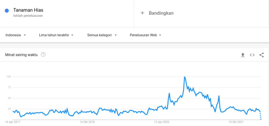 Berdasarkan grafik Google Trends, tanaman hias sempat mengalami peningkatan tren di awal hingga akhir tahun 2020. Meski begitu, masih banyak orang yang mempertahankan hobi ini, misalnya untuk dekorasi rumah.