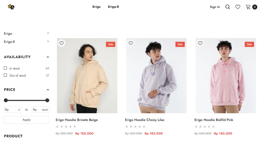Salah satu brand yang cukup sukses dengan jenis item ini adalah Erigo. Item jaket dan hoodie yang mereka jual pun tidak muluk-muluk, tapi dengan kualitas yang bisa diadu dengan merek-merek luar negeri.