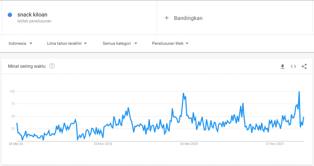 Data Google Trends menunjukkan bahwa camilan kering di Indonesia, khususnya snack kiloan, masih menjadi salah satu jualan makanan online paling laris.