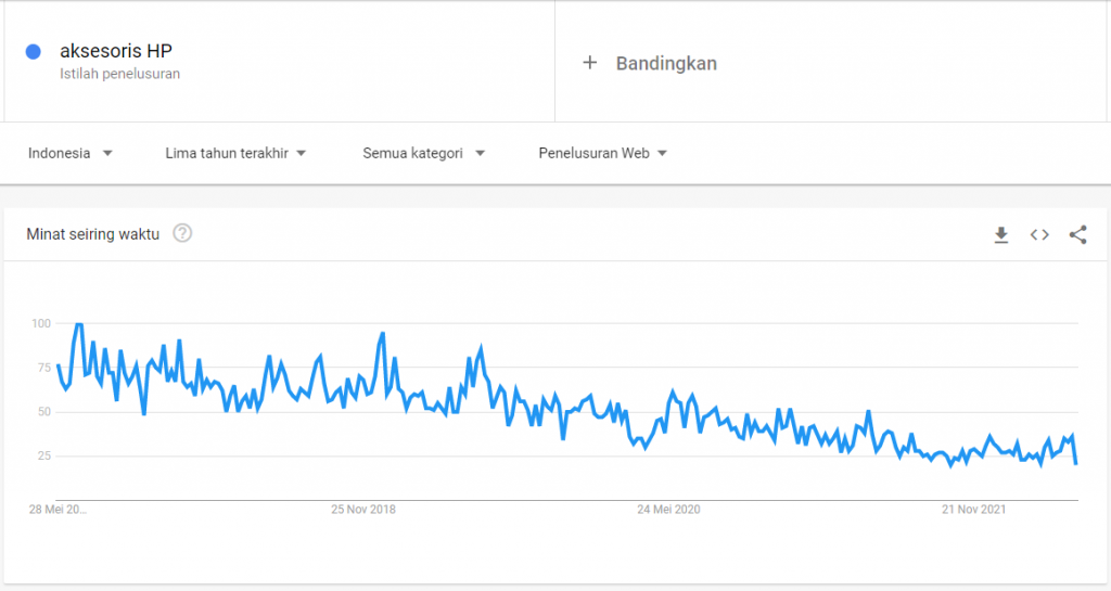 Melihat grafik Google Trends di atas, aksesoris HP adalah salah satu produk jualan online paling laris dalam 5 tahun terakhir. Setiap HP pasti butuh aksesoris sendiri, dan tidak jarang satu orang memiliki lebih dari satu handphone.