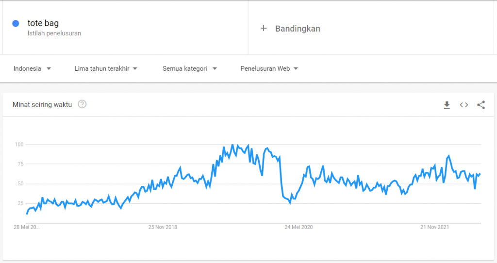 Menariknya, berdasarkan data dari Google Trends di bawah ini, popularitas tote bag meningkat secara signifikan mulai akhir tahun 2018 dan terus tinggi sampai sekarang.