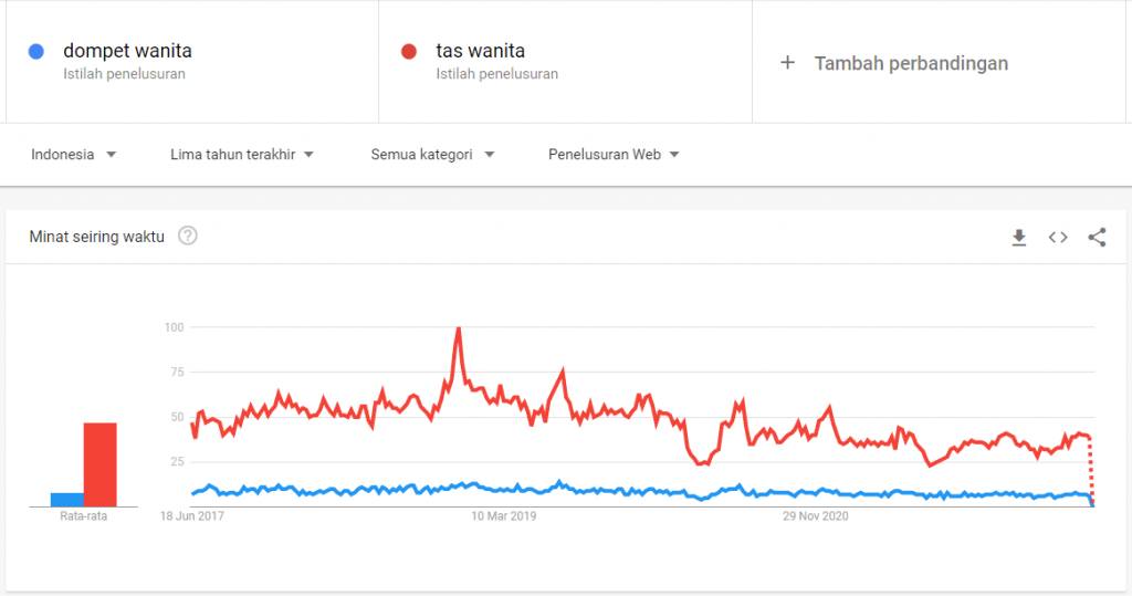 Grafik Google Trends di atas menunjukkan bahwa hasil pencarian dompet dan tas wanita lumayan fluktuatif, dan tas wanita terlihat lebih banyak dicari.