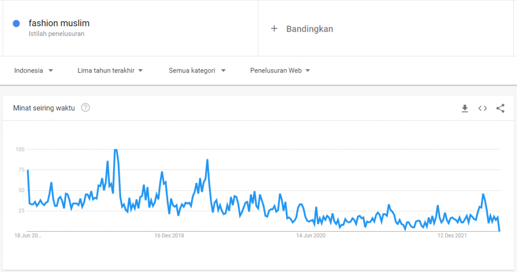 Grafik dari Google Trends ini menunjukkan bahwa fashion muslim mengalami peningkatan hasil pencarian beberapa kali saat mendekati lebaran. Hal serupa juga terjadi pada lebaran tahun 2022 lalu.