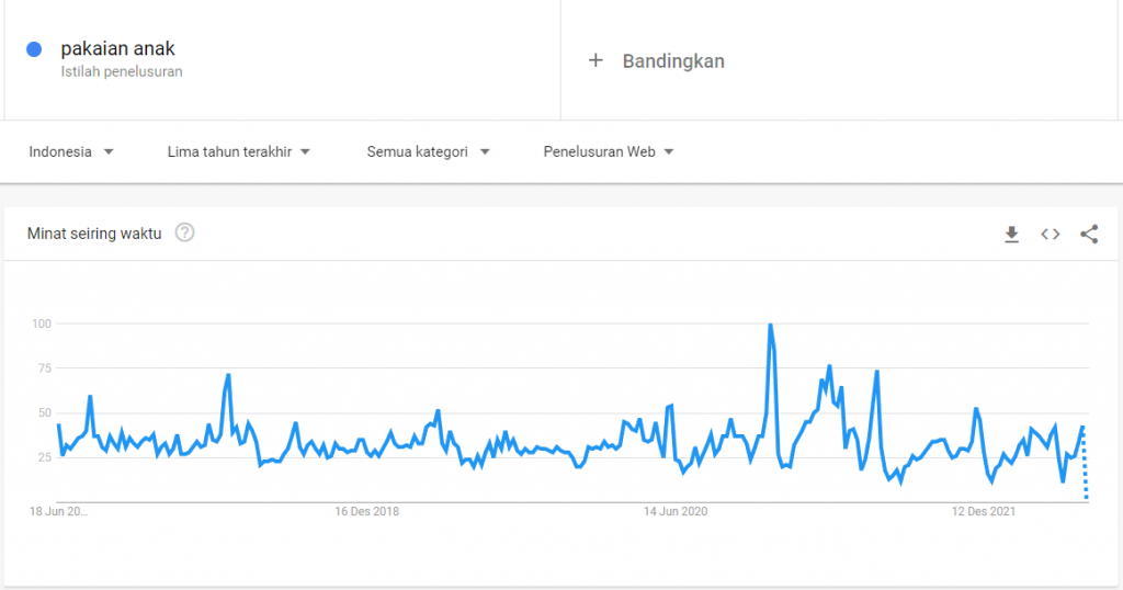 Dari grafik Google Trends di atas, hasil pencarian baju anak-anak cukup tinggi di waktu-waktu tertentu. Meski begitu, tidak menutup kemungkinan juga bahwa tren produk online terlaris ini akan terus stabil.