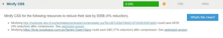 Misalnya, hasil pengujian website kami mendapatkan nilai 99 untuk CSS, dan masih ada dua file yang bisa dioptimasi lebih lanjut: