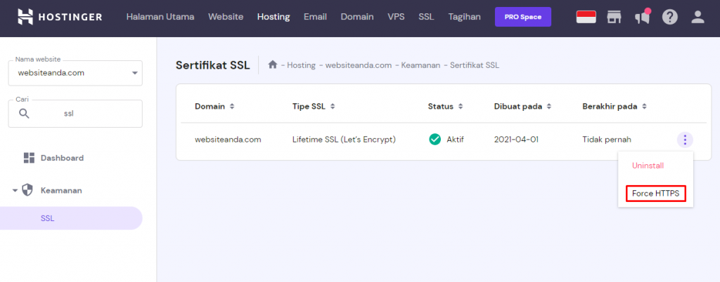 Untuk memulai cara mengaktifkan HTTPS di website, Anda bisa melakukannya melalui control panel hosting. Untuk tutorial ini, kami akan menggunakan hPanel Hostinger.