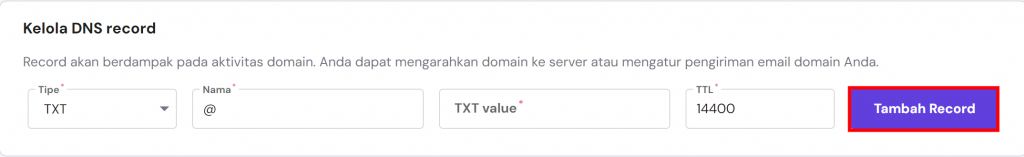 Di bagian Kelola DNS record, tambahkan data-sitekey di bawah Nama, lalu kunci rahasia Anda di bawah nilai TXT. Setelah itu, klik tombol Tambah Record.