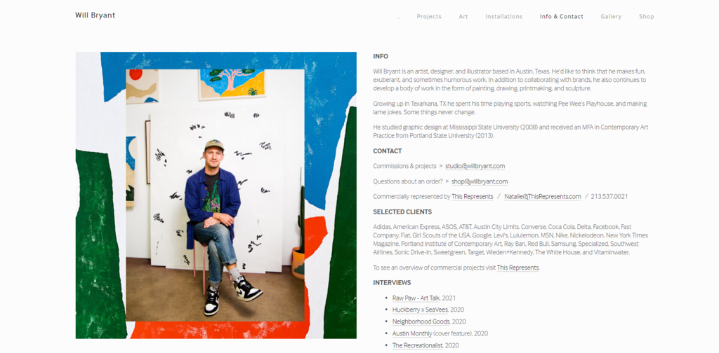 Selain itu, Anda bisa mencoba menggunakan sudut pandang orang ketiga. Meskipun terasa lebih profesional, Anda tetap boleh menyelipkan beberapa ‘fun fact’ tentang diri Anda. Contohnya ada Will Bryant di web portofolio desainnya yang menyertakan hobinya.