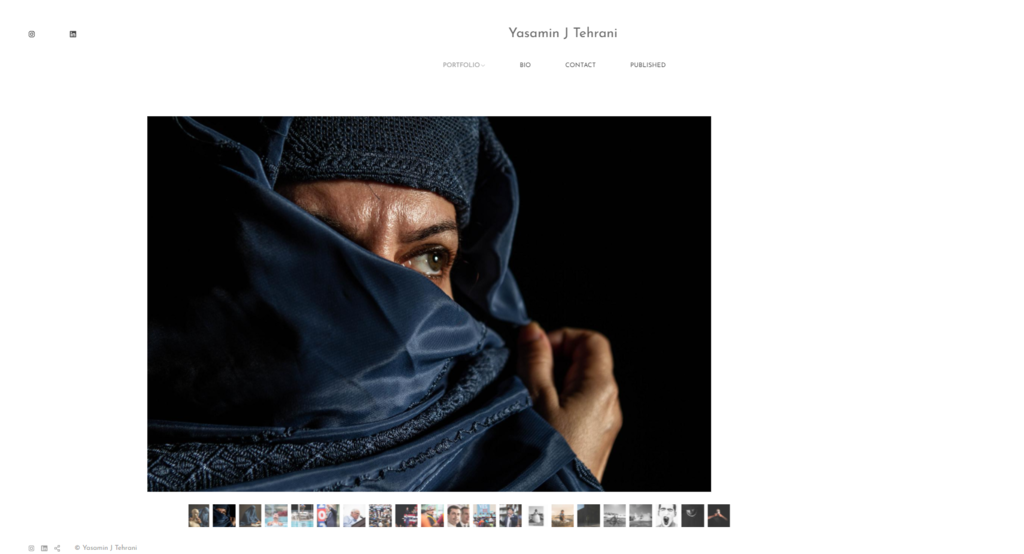 Atau Anda juga bisa melihat portofolio fotografer Yasamin J. Tehrani yang menggunakan slider galeri untuk menampilkan foto-fotonya. Dengan foto HD, portofolio semacam ini membantu pengunjung melihat kualitas dan detail karya yang lebih halus. Sayangnya, pengunjung tidak bisa melihat beberapa karya sekaligus dengan cara ini.