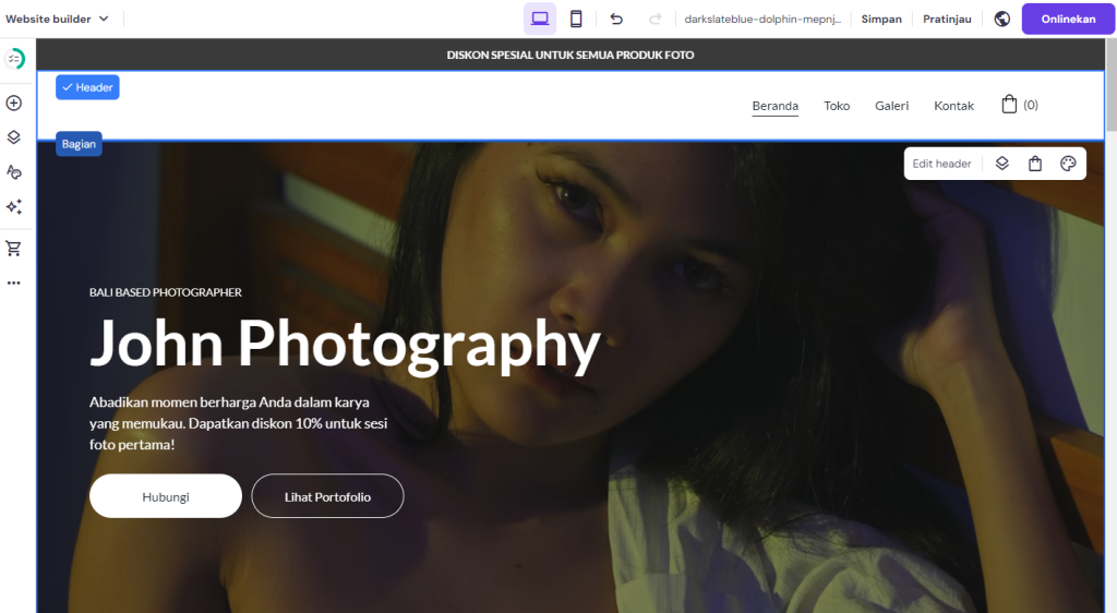Setelah menyesuaikan website, klik Onlinekan di pojok kanan atas builder untuk memublikasikan website Anda. Selamat! Sekarang, Anda sudah memiliki website yang akan membantu meningkatkan karier Anda sebagai fotografer.
